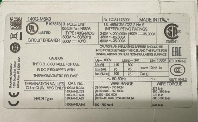 Allen Bradley 140G-M6X3 Breaker with Trip